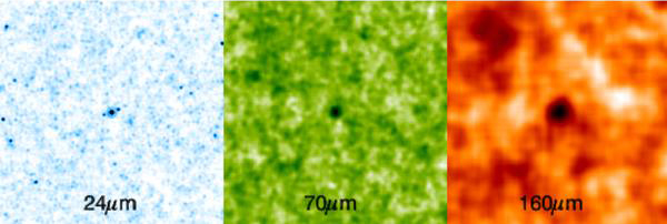 Des chercheurs de l'Institut d'Astrophysique Spatiale (CNRS - Université Paris Sud) et de l'Université d'Arizona viennent d’obtenir, grâce au photomètre multibande MIPS du satellite Spitzer de la NASA, les images parmi les plus profondes jamais prises dans l'infrarouge, principalement aux longueurs d'ondes de 24 microns et dans l’infrarouge lointain, à 70 et 160 microns. Grâce aux images à 24 microns, l’équipe a identifié près de 20 000 galaxies, dont certaines de flux apparents très faibles, et donc potentiellement très lointaines. En revanche, presque aucune galaxie n'était détectée sur les images dans l'infrarouge lointain. Or c'est dans ce domaine que les chercheurs pensaient trouver le rayonnement diffus infrarouge le plus intense.